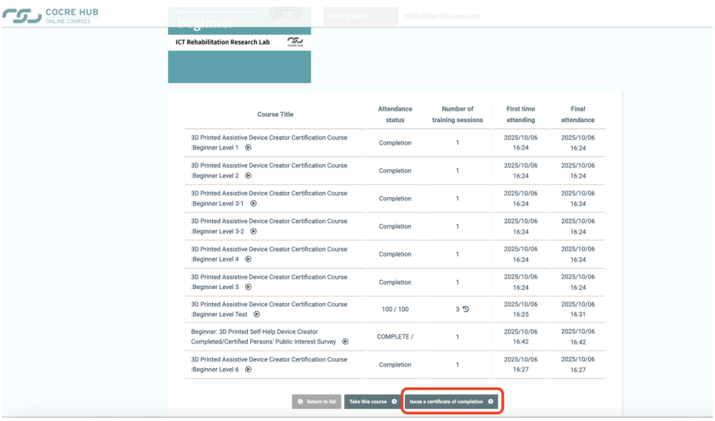 From each course’s “Status” page, go to “Learning Progress,” scroll down, and click “Issue a certification of completion”.