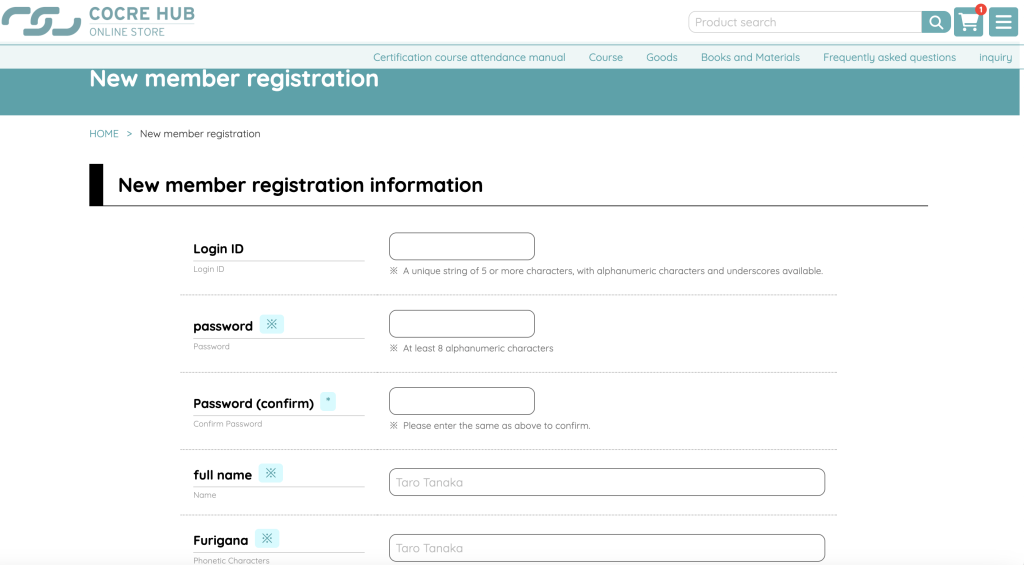 On the new member registration screen, you will create your own “Login ID” and “Password,” which will also be used for course viewing, and enter information such as your name.